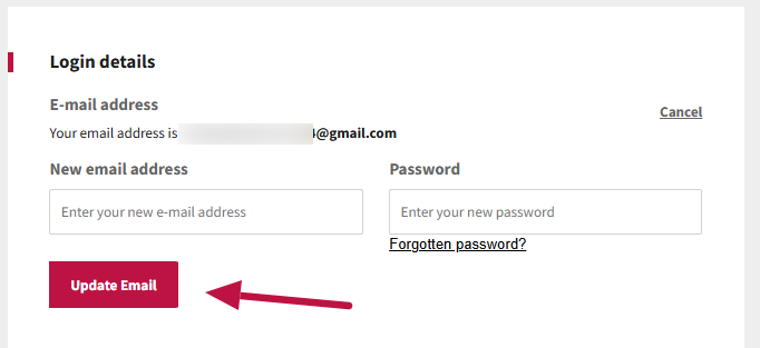 Enter your new email address: You will also need to enter your password, then click on Update email.